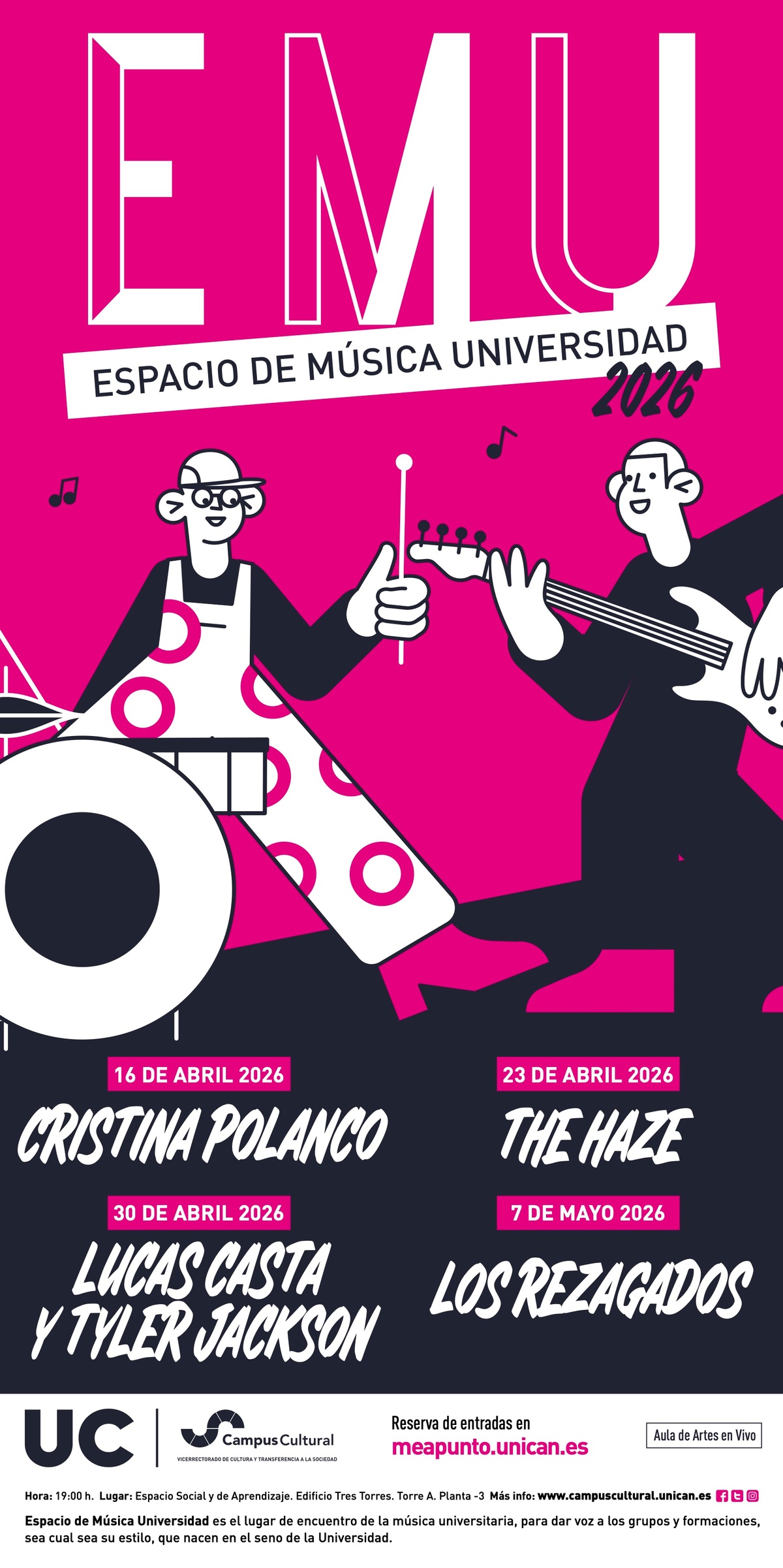 Espacio de Música Universidad (EMU) es el lugar de encuentro y descubrimiento del talento musical dentro de la UC. Se trata de un ciclo de conciertos protagonizados por estudiantes de esta universidad, sea cual sea su estilo o tendencia musical, que viene contribuyendo desde hace ya siete años a potenciar la difusión de la música joven en nuestro entorno. El 23 de abril, a las 19:00h tendrá lugar la actuación de la banda The Haze.